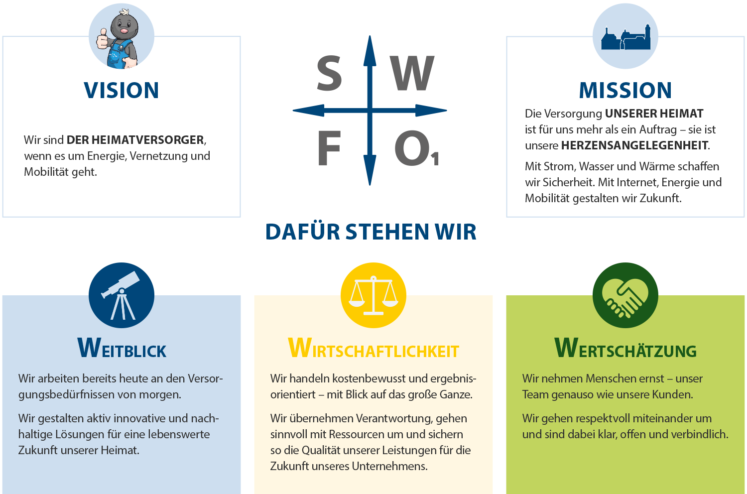 Als kommunales Stadtwerk mit 150 Mitarbeitern sind wir auf unsere Stadt und Region stolz. Wir sehen es als unsere Herzensangelegenheit an, für sauberes Trinkwasser zu sorgen, unsere Kunden zuverlässig mit Strom, Gas und Telekommunikation zu versorgen und die Infrastruktur der Stadt mit zukunftssicheren Technologien auszubauen.